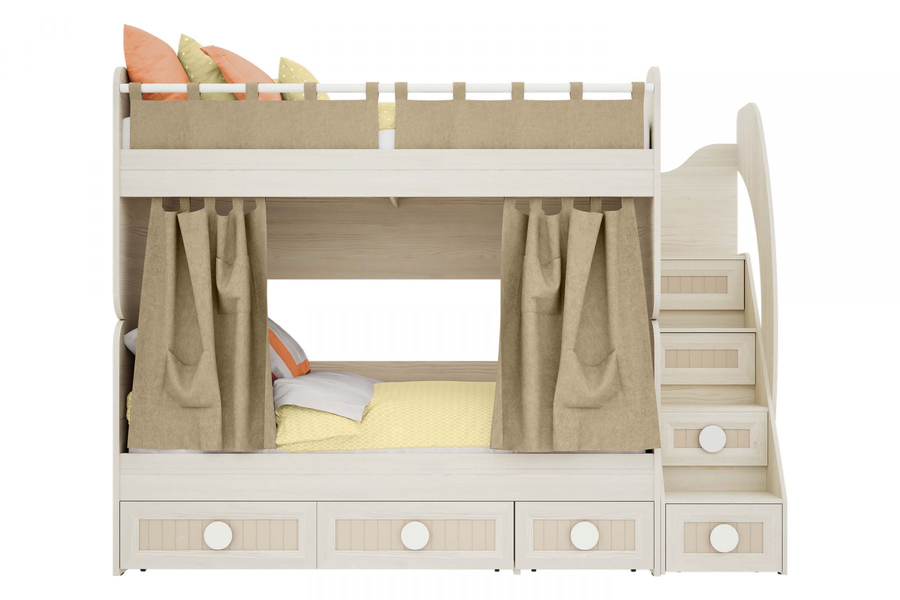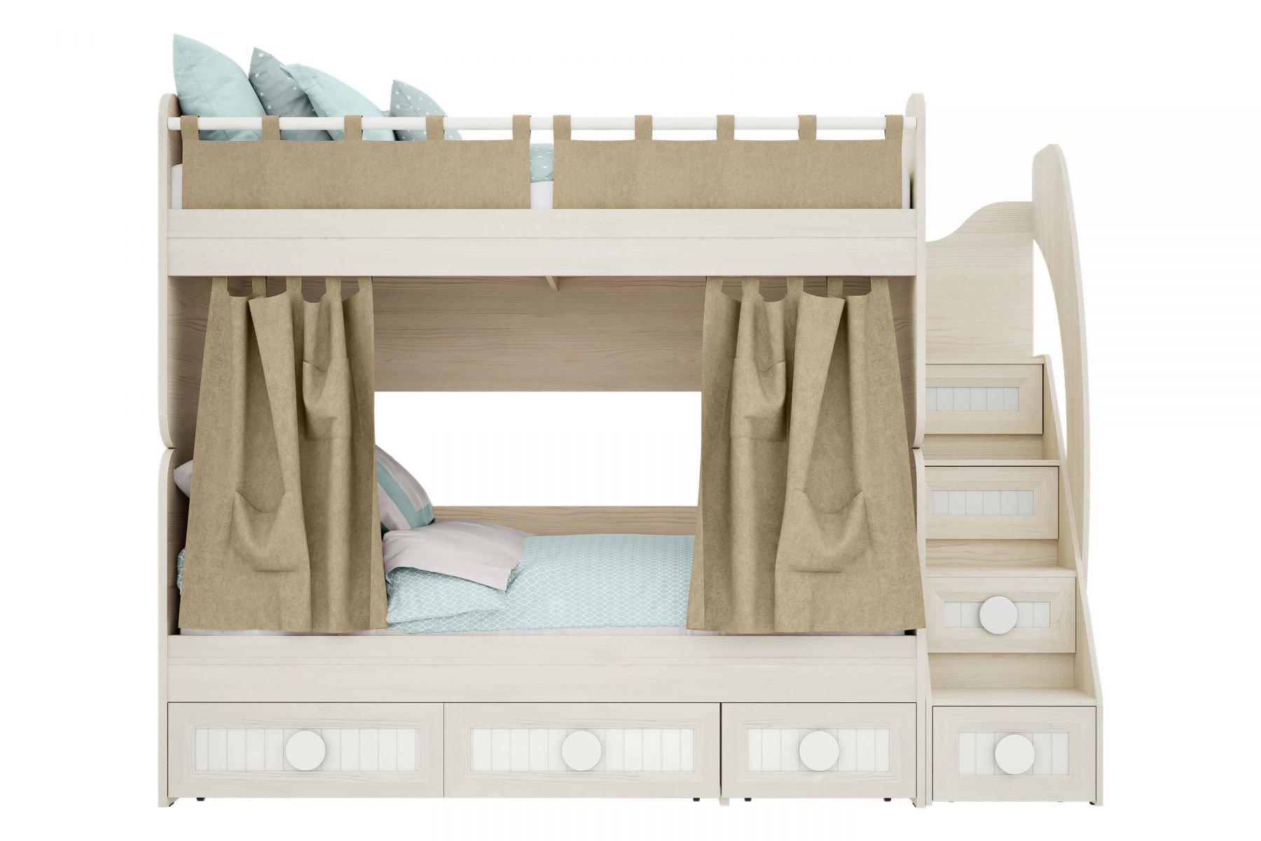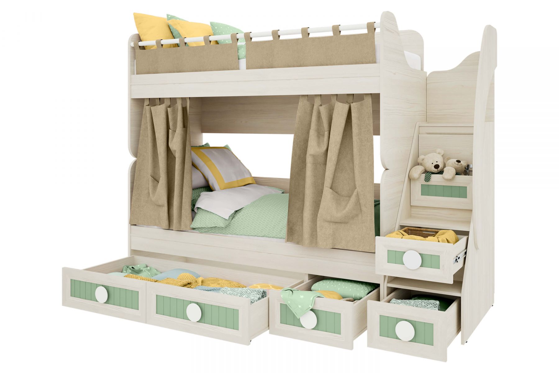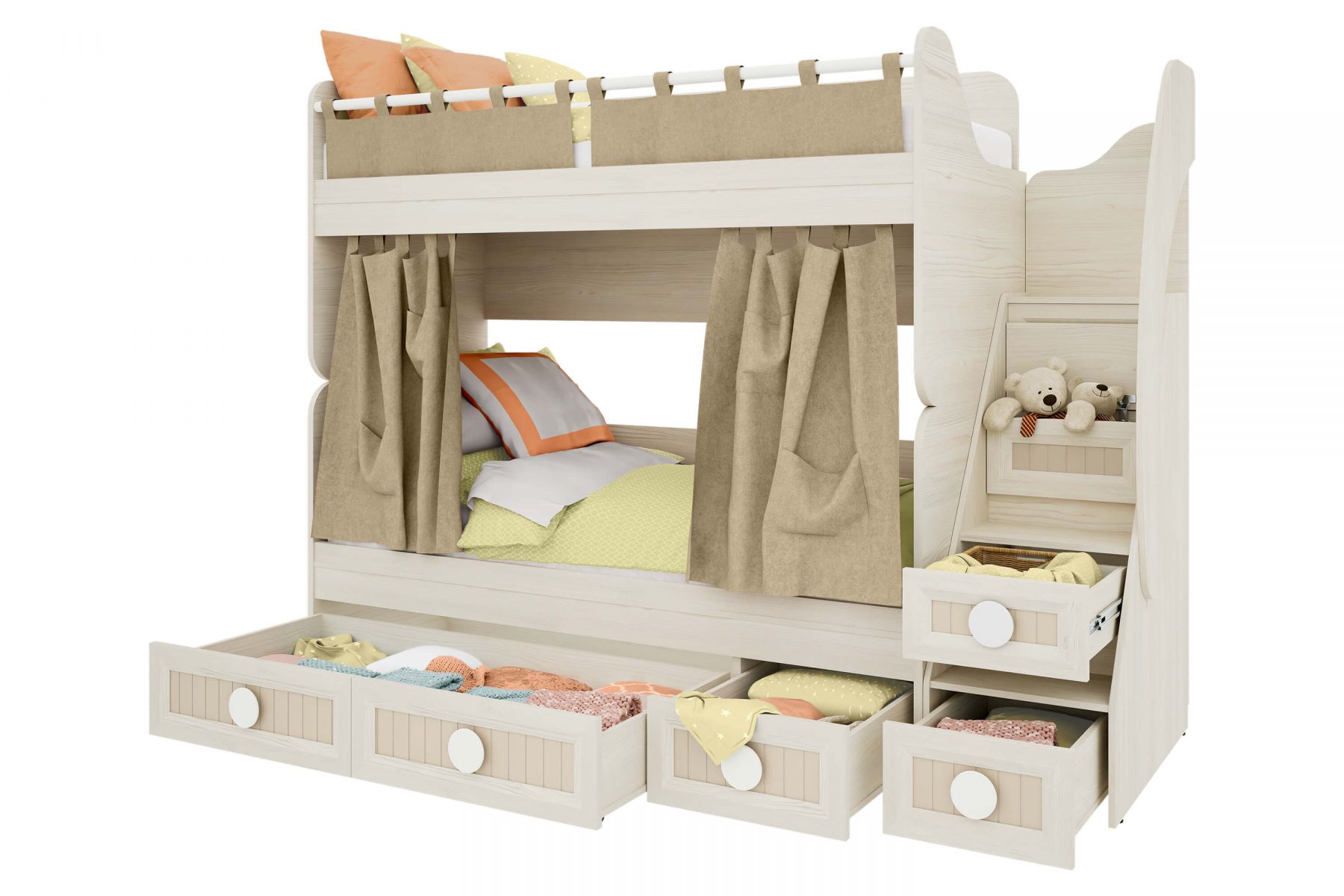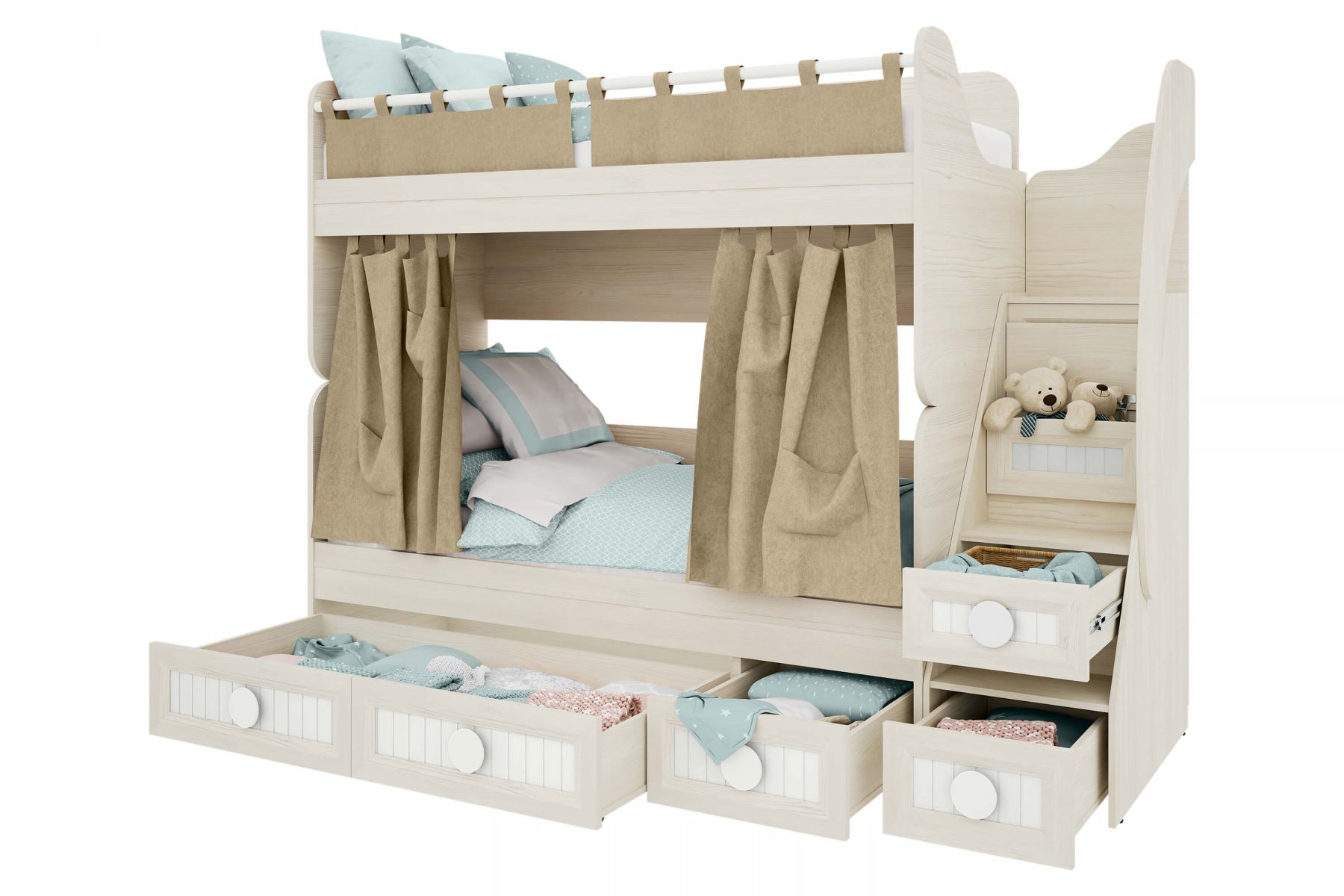 Верхний ярус кровати оснащен защитным бортиком, который обеспечивает безопасность во время сна. Нижний ярус, по желанию, можно укомплектовать шторками, создав уютное и уединенное пространство для отдыха. Лестница-трап с удобными широкими ступенями представляет собой систему хранения из двух выдвижных ящиков (один — на колесиках и усиленным дном из лдсп, второй — на направляющих с полным доступом к содержимому) и ящика с крышкой на внутренних петлях.