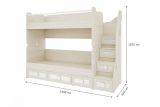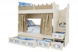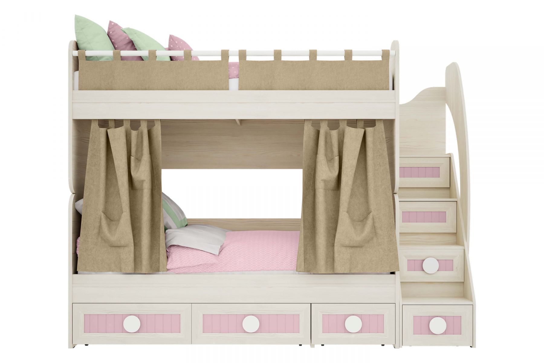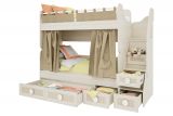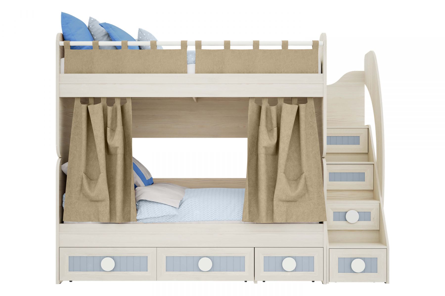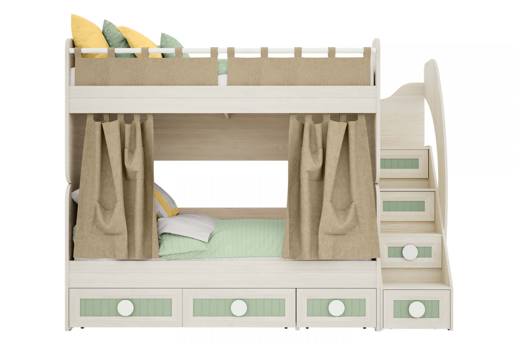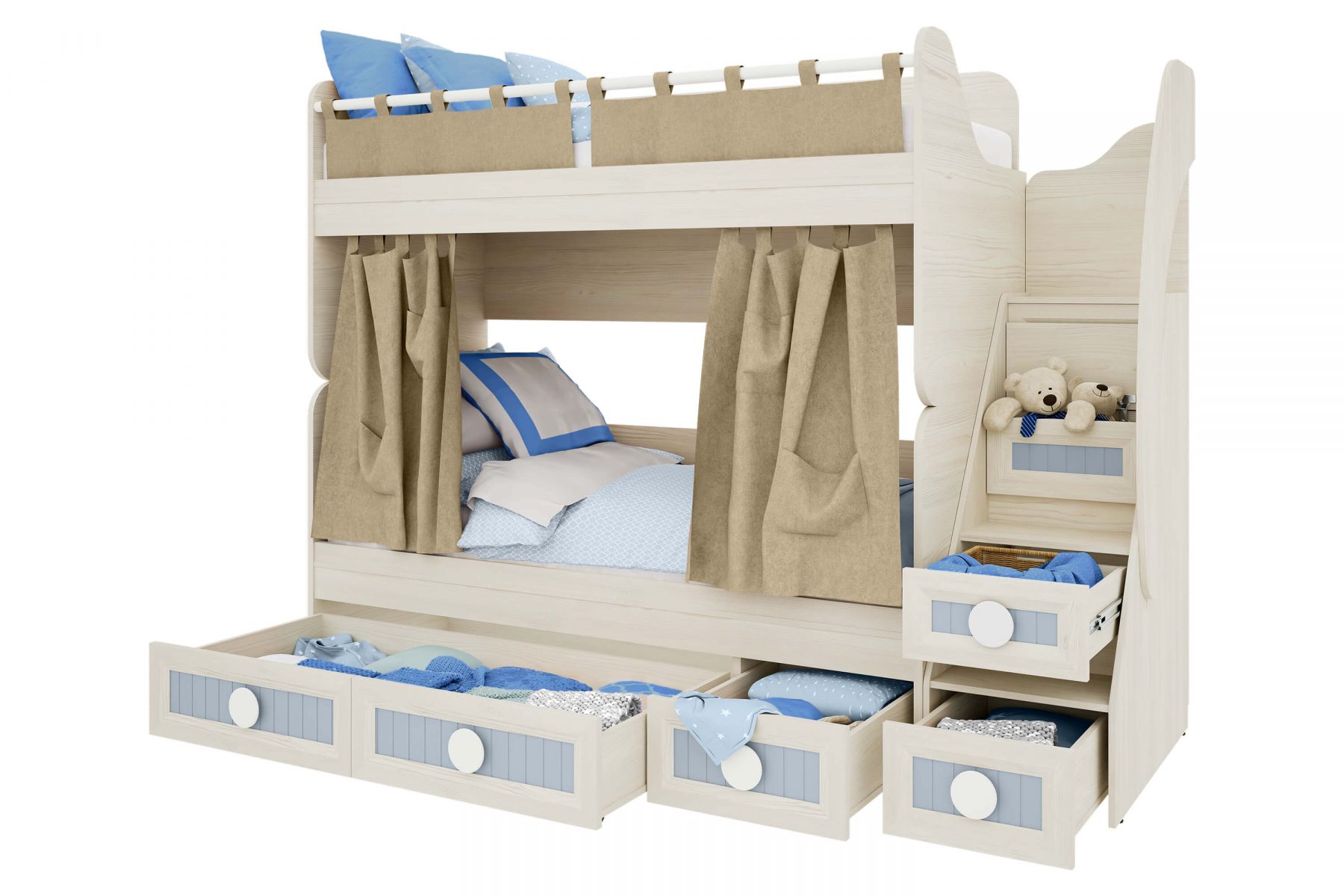 Верхний ярус кровати оснащен защитным бортиком, который обеспечивает безопасность во время сна. Нижний ярус, по желанию, можно укомплектовать шторками, создав уютное и уединенное пространство для отдыха. Лестница-трап с удобными широкими ступенями представляет собой систему хранения из двух выдвижных ящиков (один — на колесиках и усиленным дном из лдсп, второй — на направляющих с полным доступом к содержимому) и ящика с крышкой на внутренних петлях.